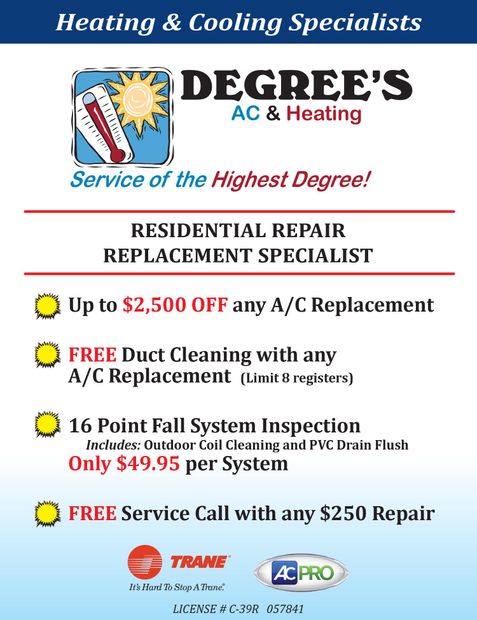Choosing Degree’s AC means partnering with a local, family-owned, and veteran-owned business that truly cares about your comfort. Your comfort shouldn’t be cost-prohibitive. We offer a free duct cleaning with any air conditioner replacement, and we provide a free, two-year maintenance agreement with a new installation.